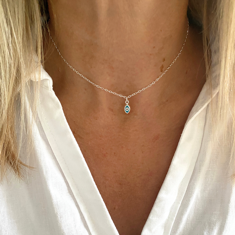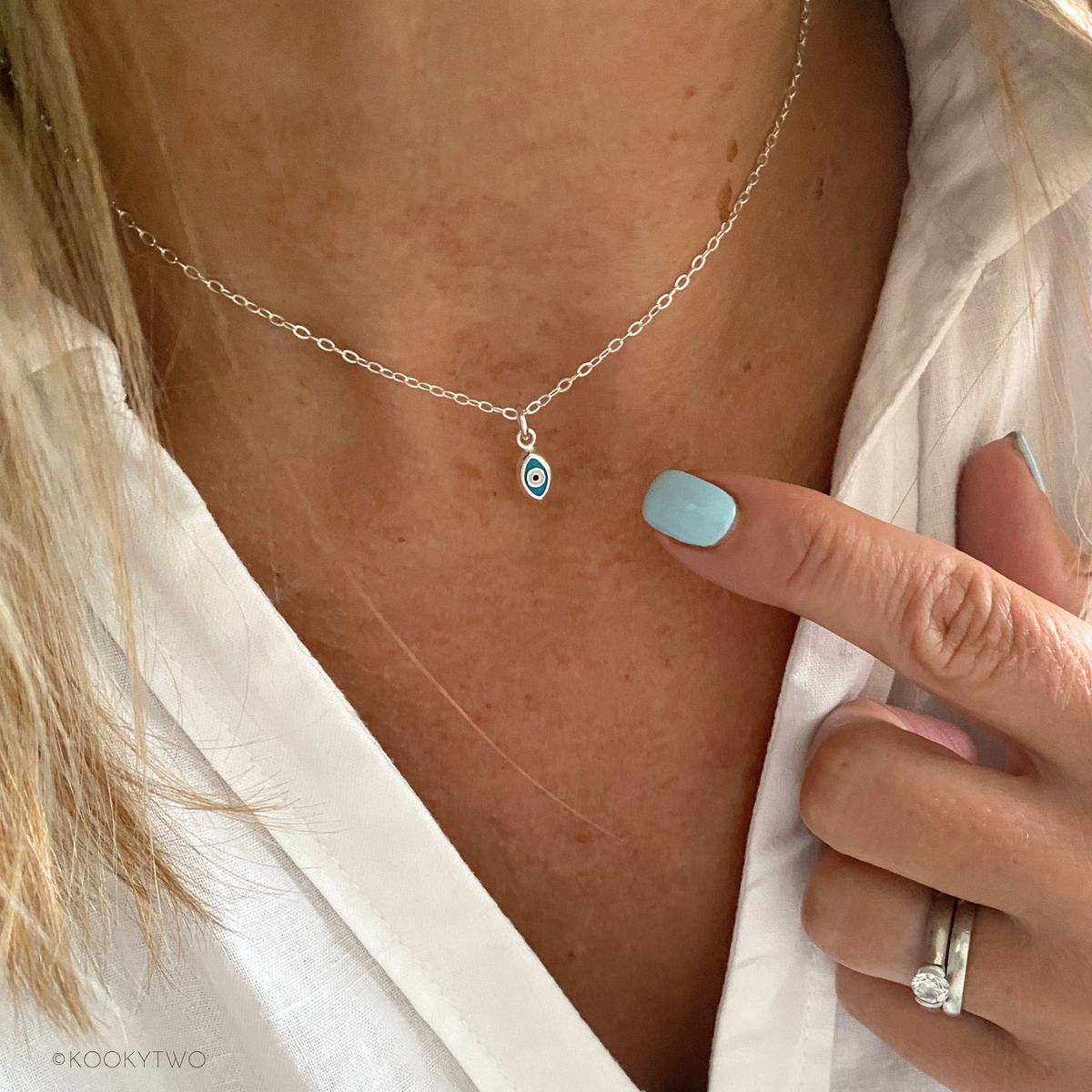 Evil eye jewellery with silver necklace and evil eye charm necklace for everyday wear. KookyTwo Jewellery.