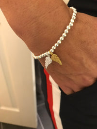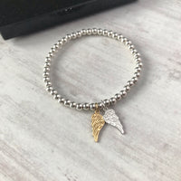 Modern sterling silver and gold double angel wing bracelet. Angel wings are said to be a symbol of freedom, inspiration, protection, affection and harmony, to bring hope and happiness.