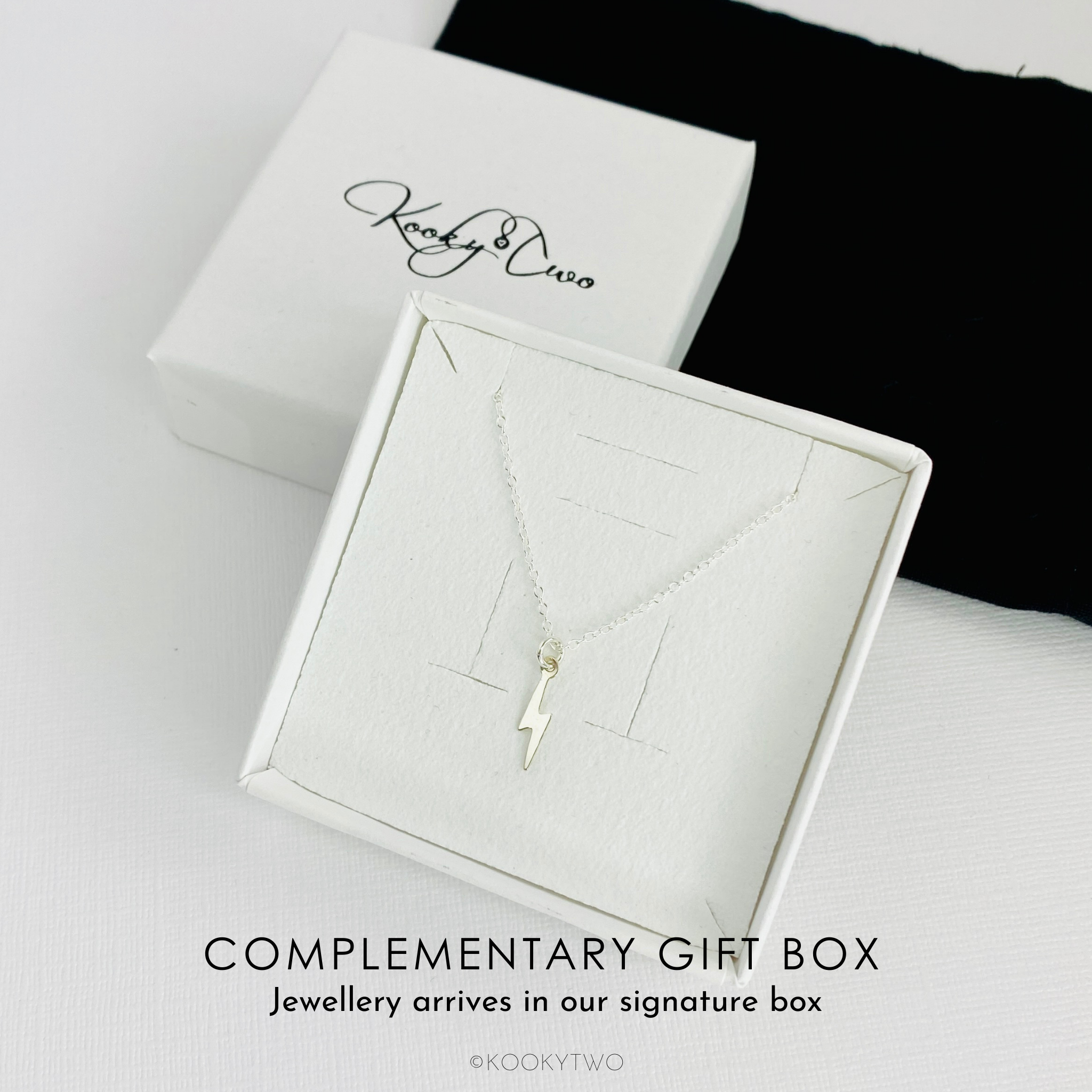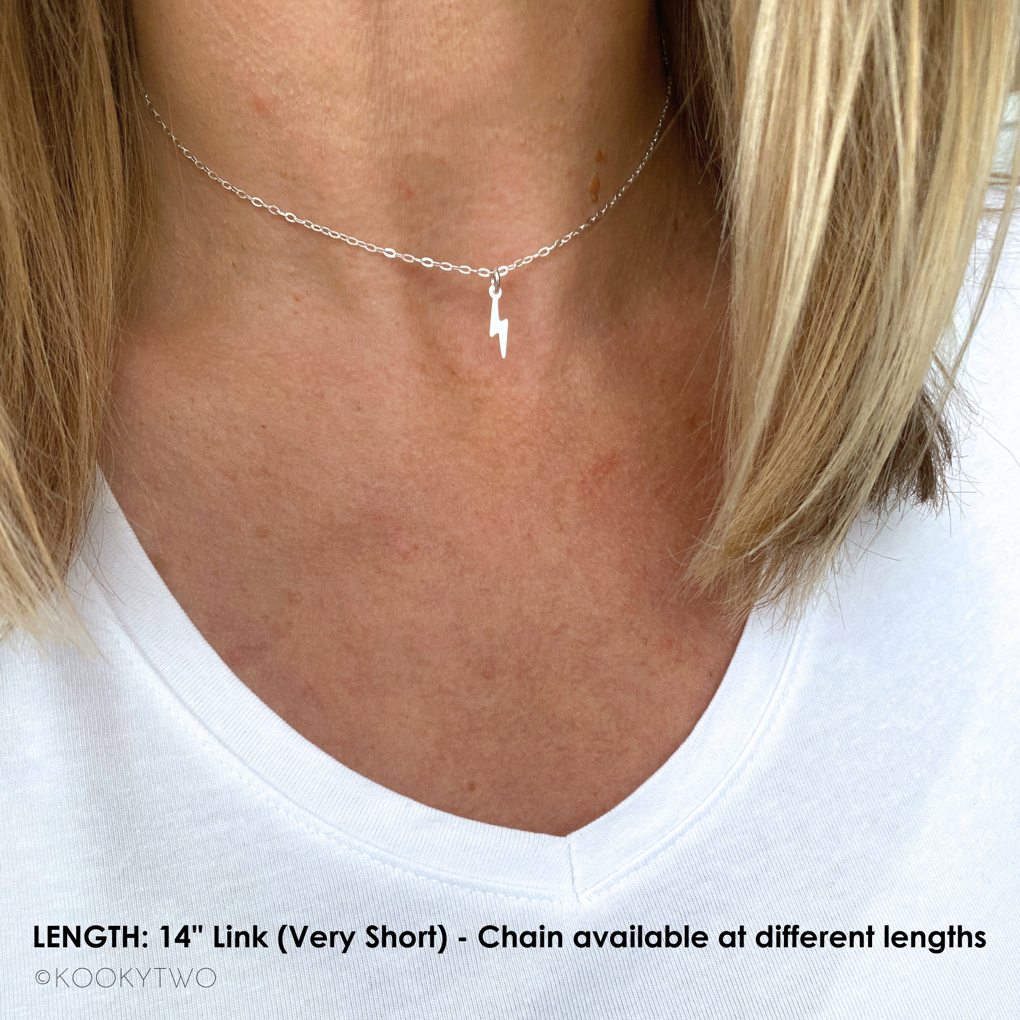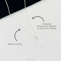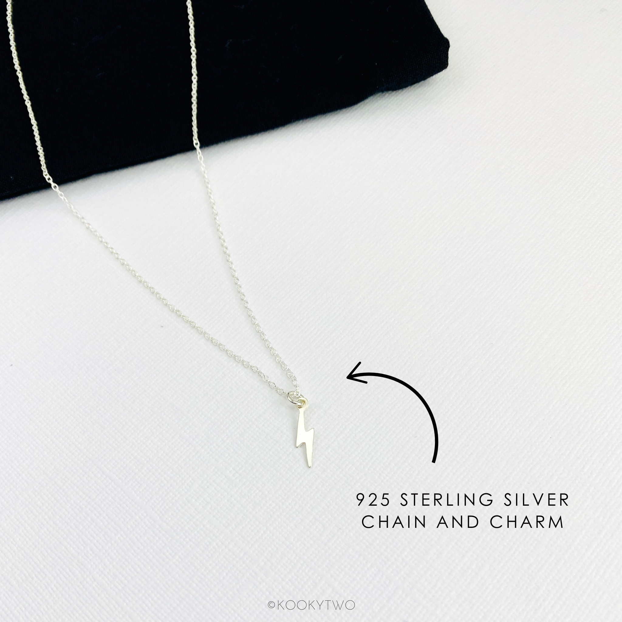 Dainty modern sterling silver lightning bolt necklace. Pretty minimalist lightning charm is available on a choice of sterling silver chains.