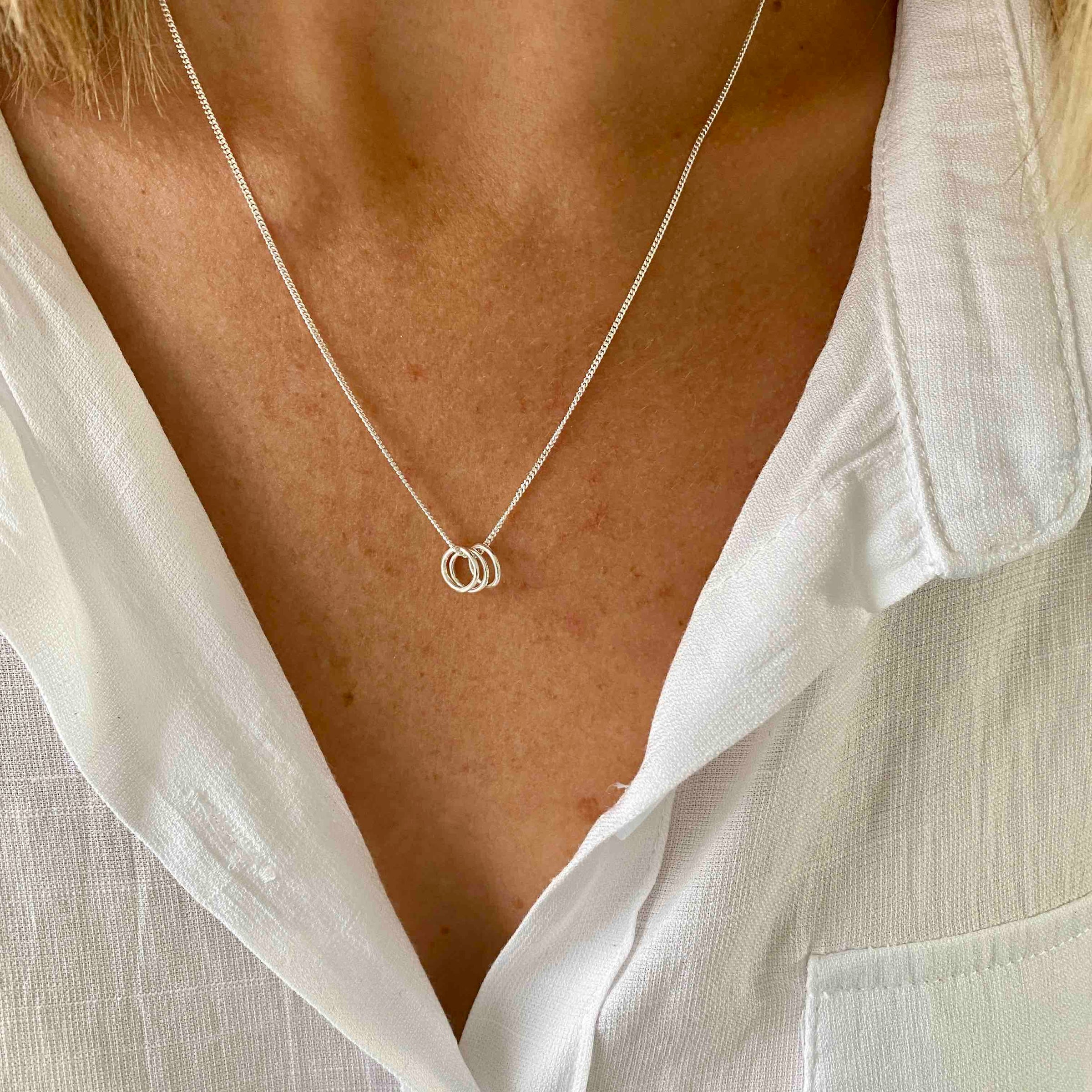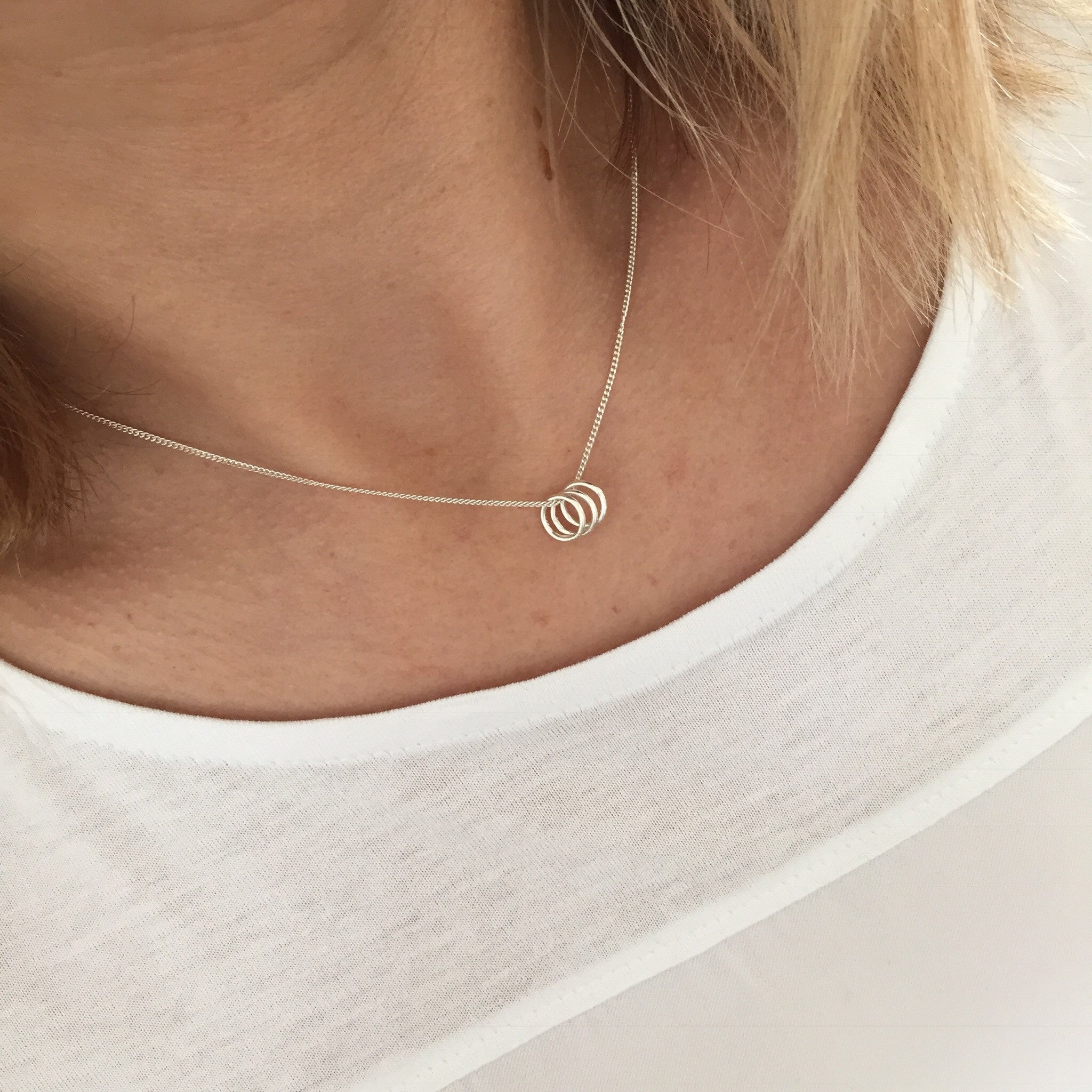 Lovely stylish contemporary necklace with 3 pretty silver rings. Wear this sterling silver necklace to symbolise special moments in life. Wear to celebrate your family, best friends, life's achievements, 30th birthday and more. A truly gorgeous necklace, available on a choice of sterling silver chains.